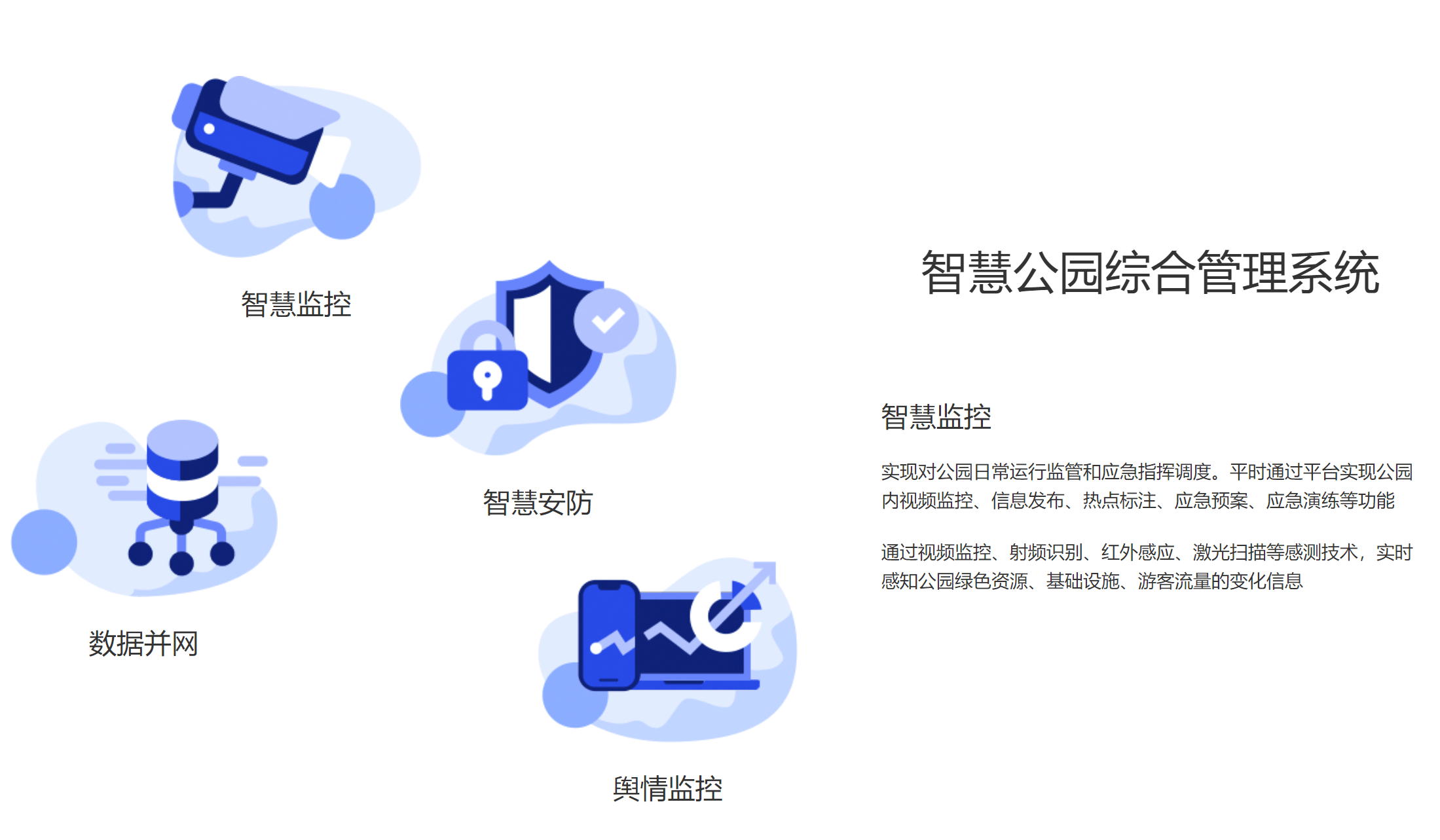 通过视频监控、射频识别、红外感应、激光扫描等感测技术,实时感知公园绿色资源、基础设施、游客流量的变化信息
